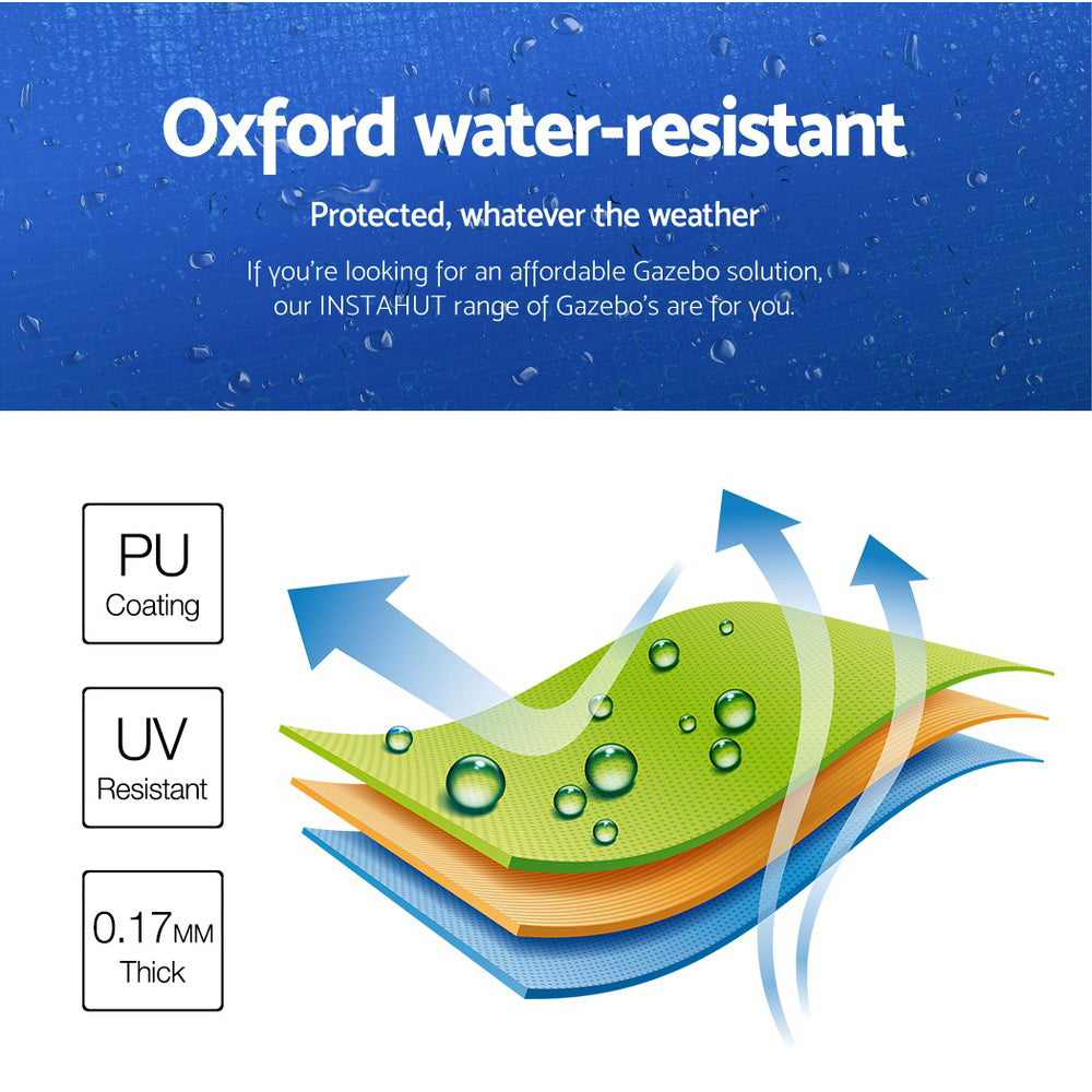 With a wide roof coverage of 300cm by 600cm, the exceptional 6kg cover is made of durable PU coating Oxford fabric that’s both UV and water resistant. No more worries about being too hot or too wet, you can get your event going with total peace of mind from the elements. Giving you ample dry cover from rain and adequate protection from UV radiation.